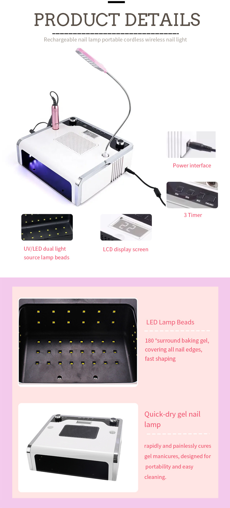 Multifunkční lampa na nehty 4 v 1 zajišťuje rovnoměrné zasychání lepidla bez smršťování. Jeho duální světelné zdroje poskytují jemné zahřívání, aby se zabránilo zabarvení rukou a namáhání očí, vhodné pro ruce i nohy a poskytují pozoruhodně rychlé výsledky sušení.