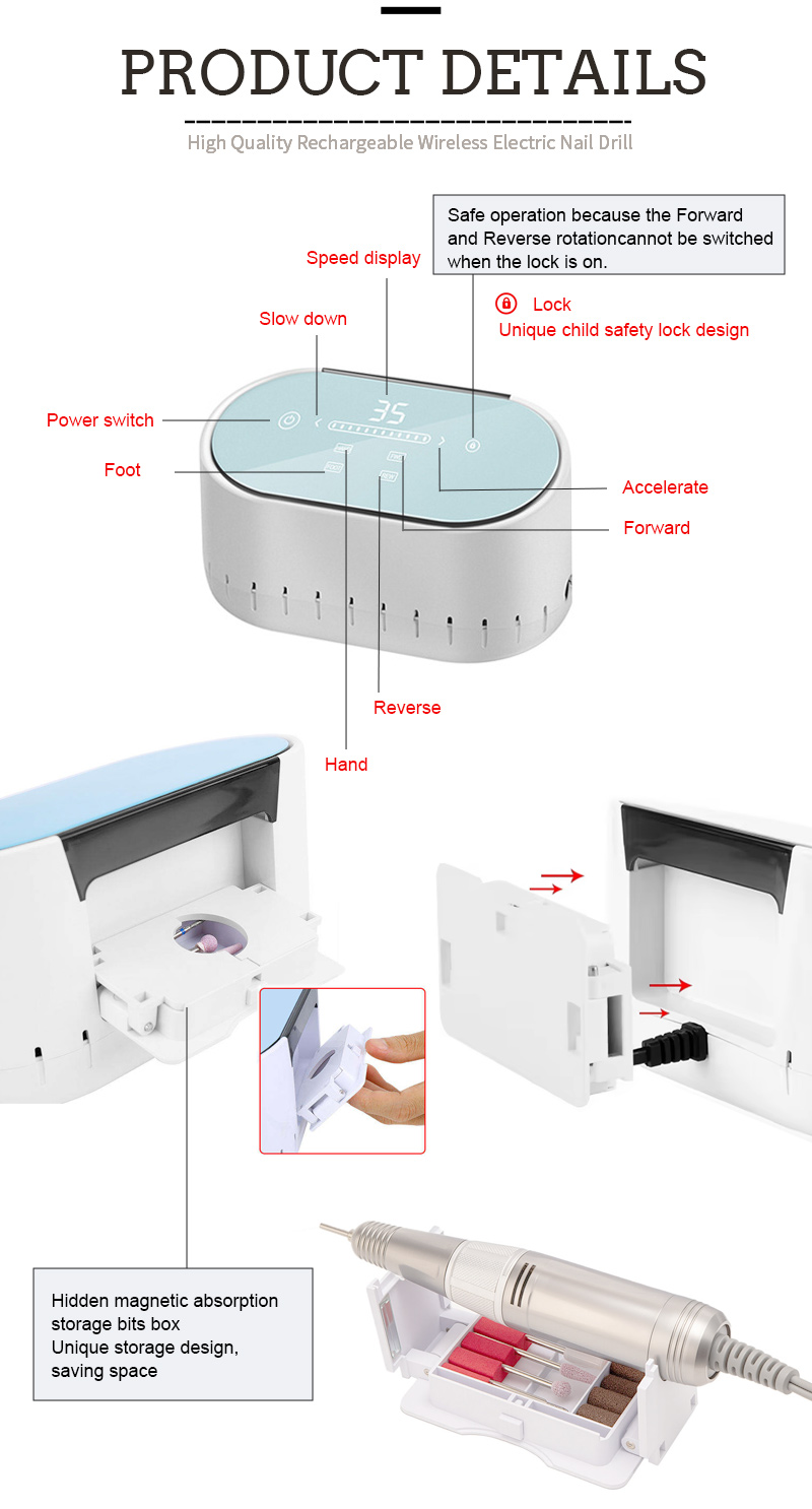 Nabíjecí sada vrtáků na nehty Vrták na nehty na prstech 35w 35000 ot./min.
