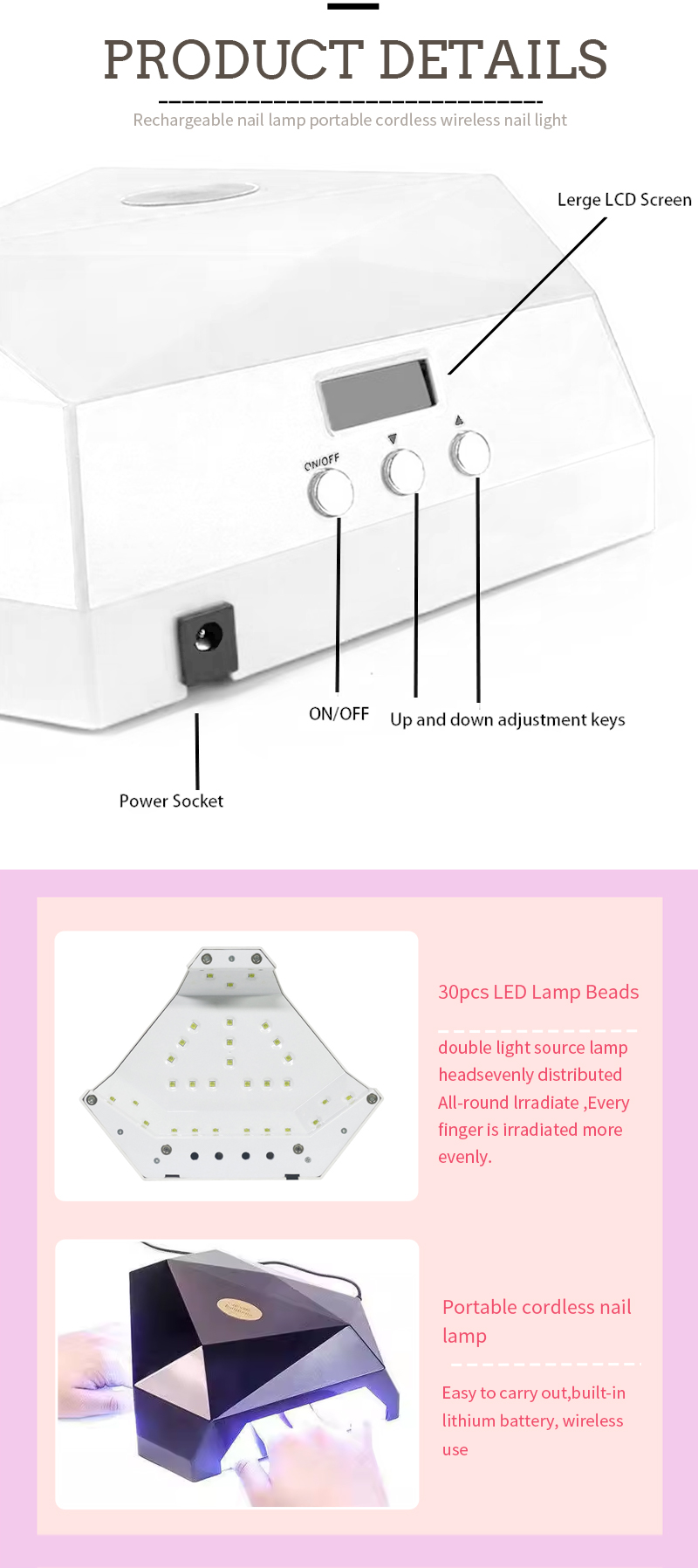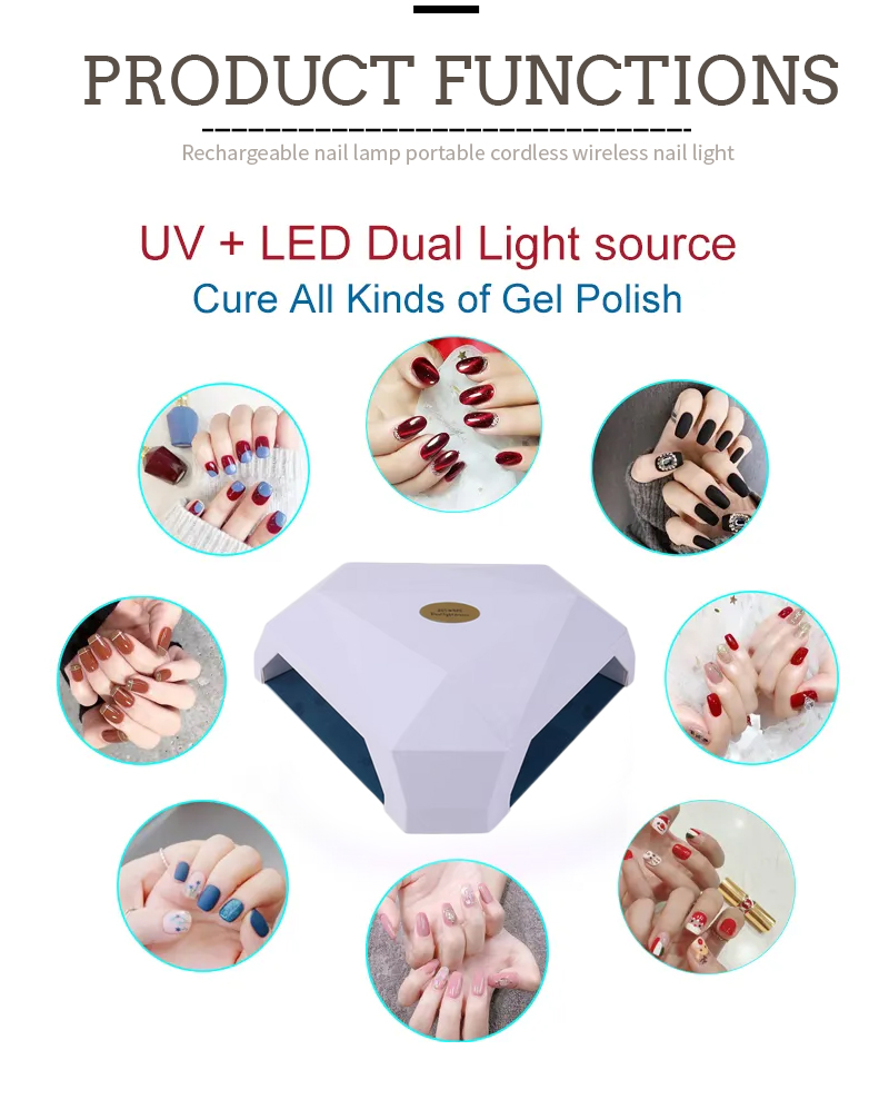 Produkt zajišťuje sušení lepidla bez smršťování. Jeho zdroje dvojího světla poskytují jemné vytápění, aby se zabránilo zabarvení rukou a napětí oka, vhodné pro ruce i nohy, což poskytuje pozoruhodně rychlé výsledky sušení.