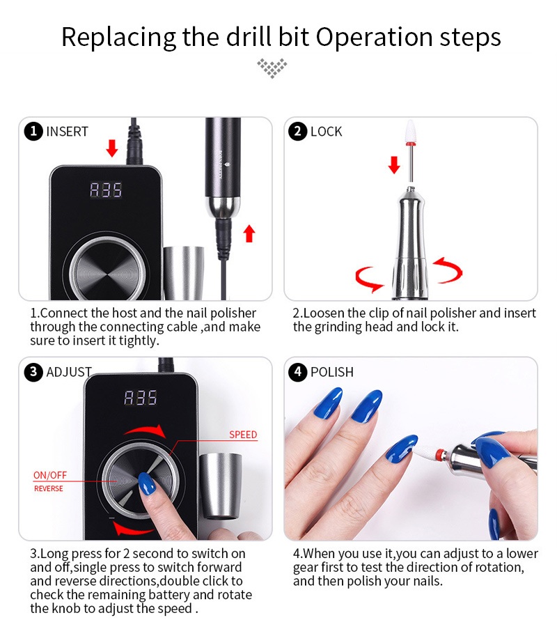 Tuto exfoliační 35 000 ot./min elektrickou vrtačku na nehty náhradní vrtačku provozní metodu, to znamená zasunout a vytáhnout, snadnou a pohodlnou, výměnu lze použít po dokončení.