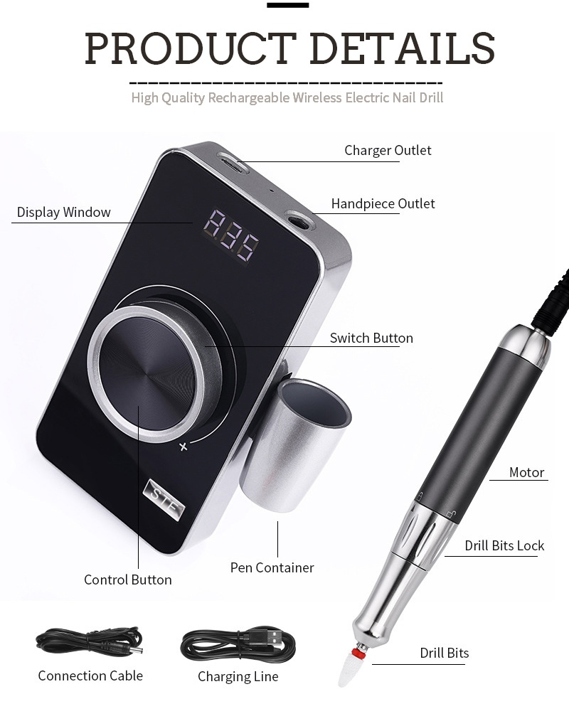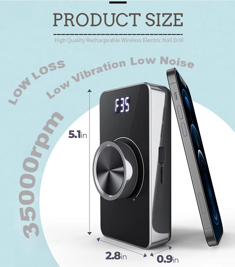 Design displeje této exfoliační elektrické vrtačky na nehty s 35 000 otáčkami za minutu má vypínač zapnuto/vypnuto a otáčení vpřed/vzad pro aktivaci celkem jedním tlačítkem, zásuvku pro rychlé nabíjení ve spodní části, výměnnou zásuvku pro vrtání v horní části a třípolohovou nastavitelnou rychlost pro splnění různých potřeb.