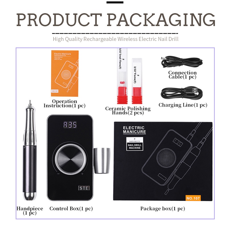 Obsah této exfoliační elektrické vrtačky na nehty s 35 000 otáčkami za minutu obsahuje brusné pero, nabíjecí kabel USB, návod k použití a lehkou a přenosnou krabičku.