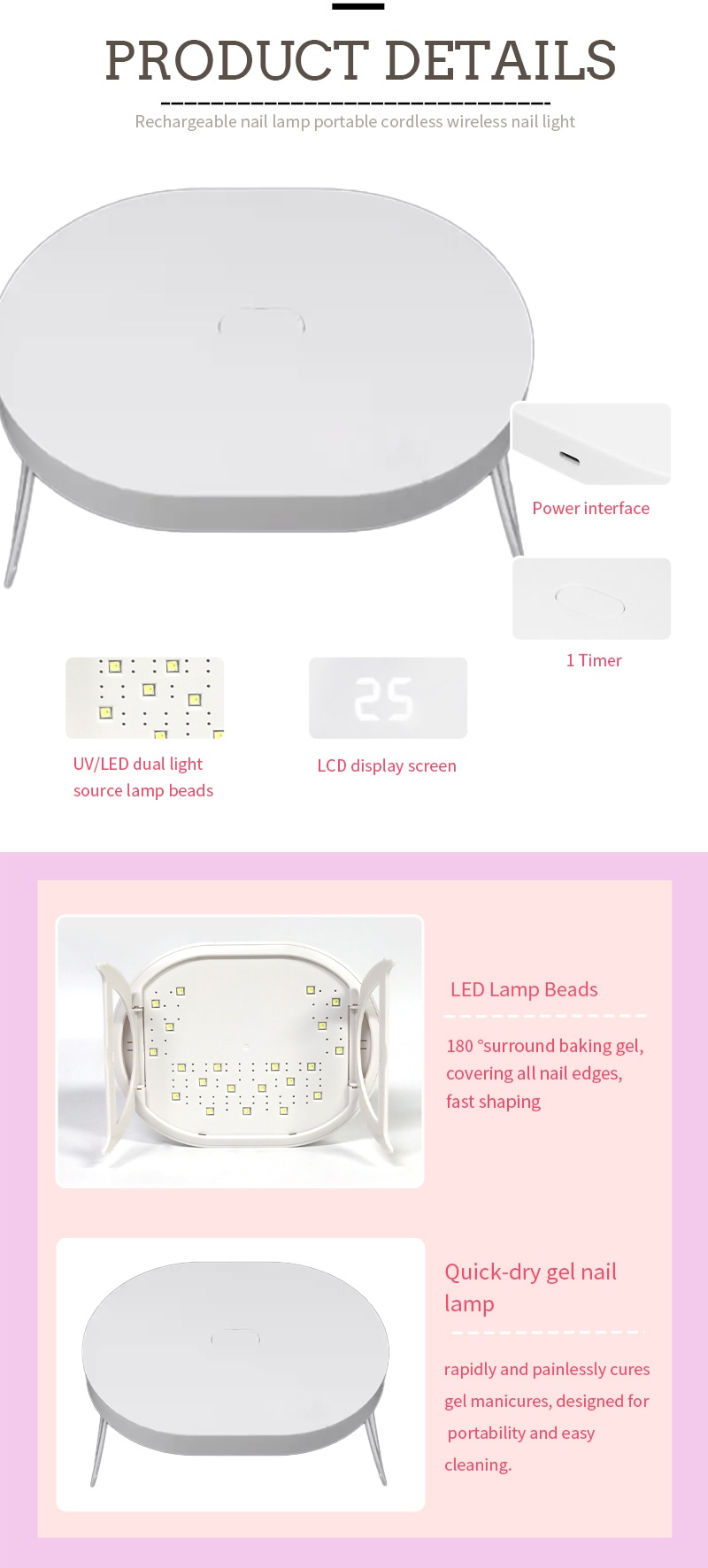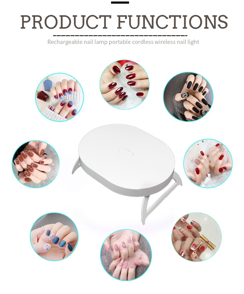 Skládací mini lampa na sušení nehtů zajišťuje rovnoměrné zasychání lepidla bez smrštění. Jeho duální světelné zdroje poskytují jemné zahřívání, aby se zabránilo zabarvení rukou a namáhání očí, vhodné pro ruce i nohy a poskytují pozoruhodně rychlé výsledky sušení.