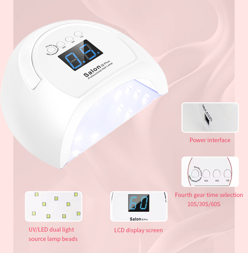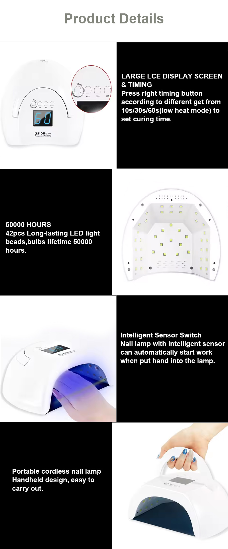 Produkt zajišťuje rovnoměrné zasychání lepidla bez smršťování. Jeho duální světelné zdroje poskytují jemné zahřívání, aby se zabránilo zabarvení rukou a namáhání očí, vhodné pro ruce i nohy a poskytují pozoruhodně rychlé výsledky sušení.