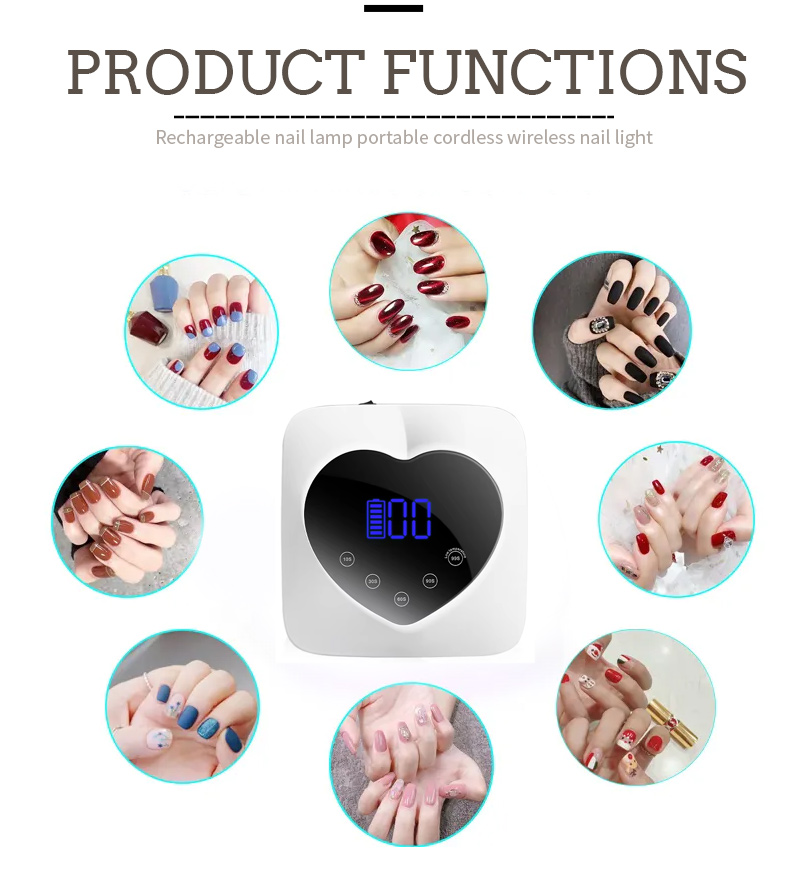 Produkt zajišťuje sušení lepidla bez smršťování. Jeho zdroje dvojího světla poskytují jemné vytápění, aby se zabránilo zabarvení rukou a napětí oka, vhodné pro ruce i nohy, což poskytuje pozoruhodně rychlé výsledky sušení.