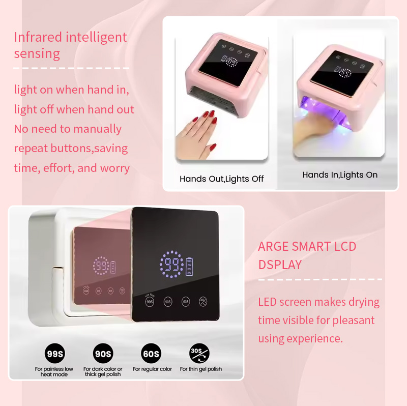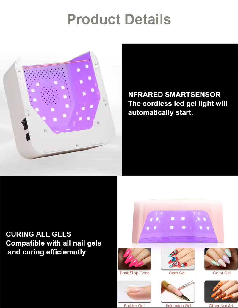 Tato vysoce kvalitní rychleschnoucí lampa na gel lak na nehty zajišťuje rovnoměrné zasychání lepidla bez smršťování. Jeho duální světelné zdroje poskytují jemné zahřívání, aby se zabránilo zabarvení rukou a namáhání očí, vhodné pro ruce i nohy a poskytují pozoruhodně rychlé výsledky sušení.