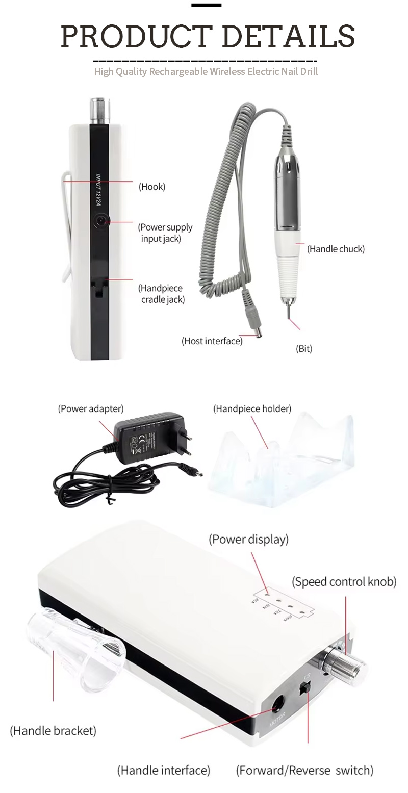 Nabíjecí sada vrtáků na nehty s výkonným násadec 45w 35000 ot./min