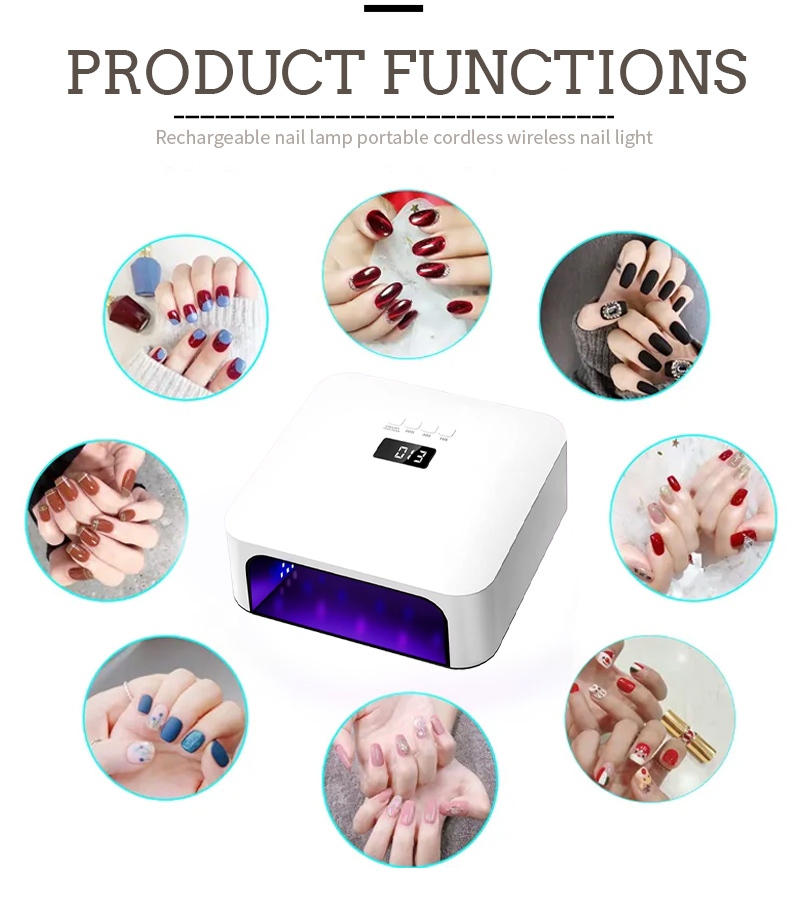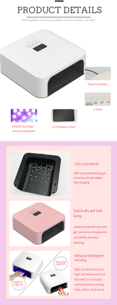 Vysoce kvalitní lampa na rychlé sušení nehtů zajišťuje rovnoměrné zasychání lepidla bez smršťování. Jeho duální světelné zdroje poskytují jemné zahřívání, aby se zabránilo zabarvení rukou a namáhání očí, vhodné pro ruce i nohy a poskytují pozoruhodně rychlé výsledky sušení.
