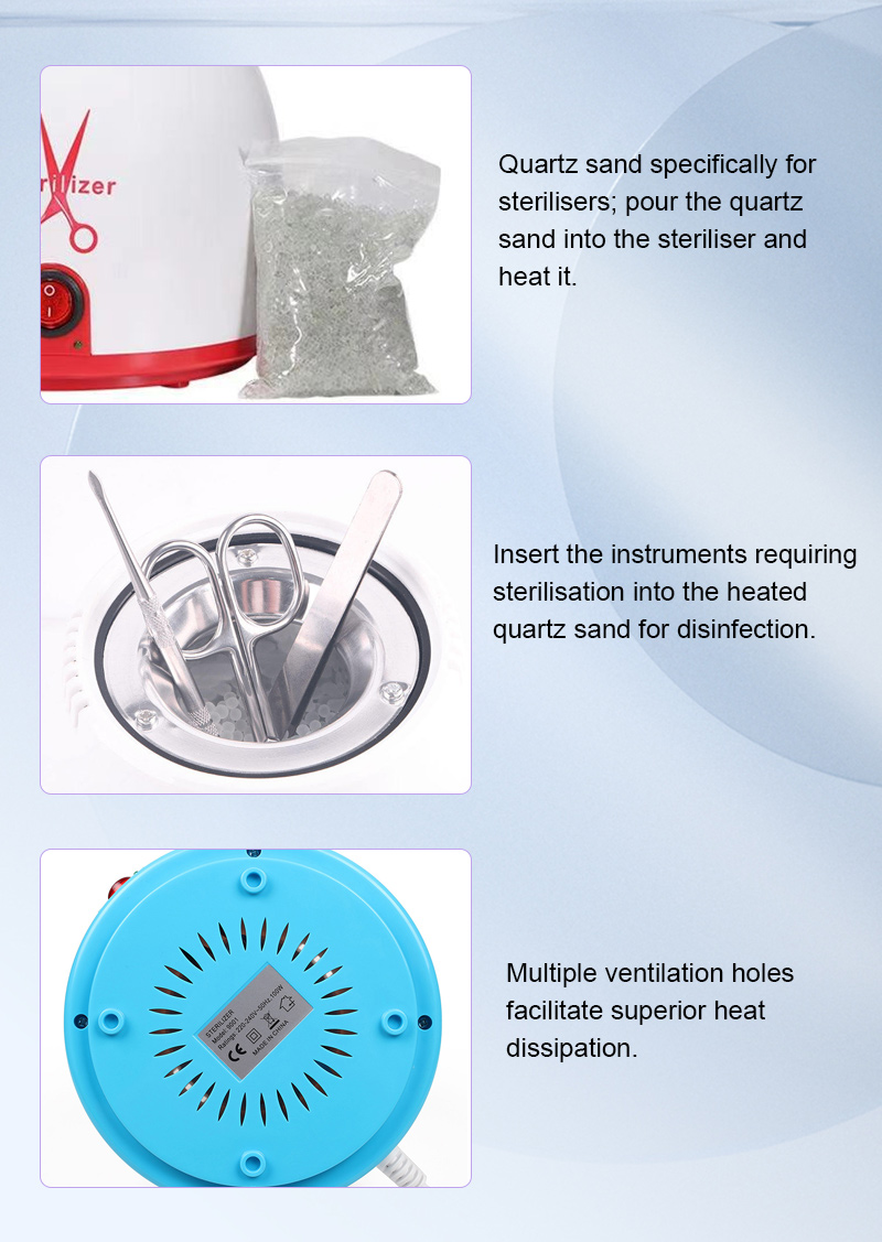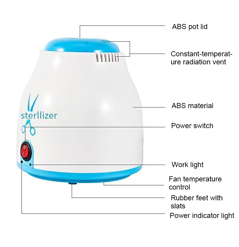 Tento sterilizátor primárně generuje teplo prostřednictvím topného prstence a využívá vysoké teploty k dezinfekci.