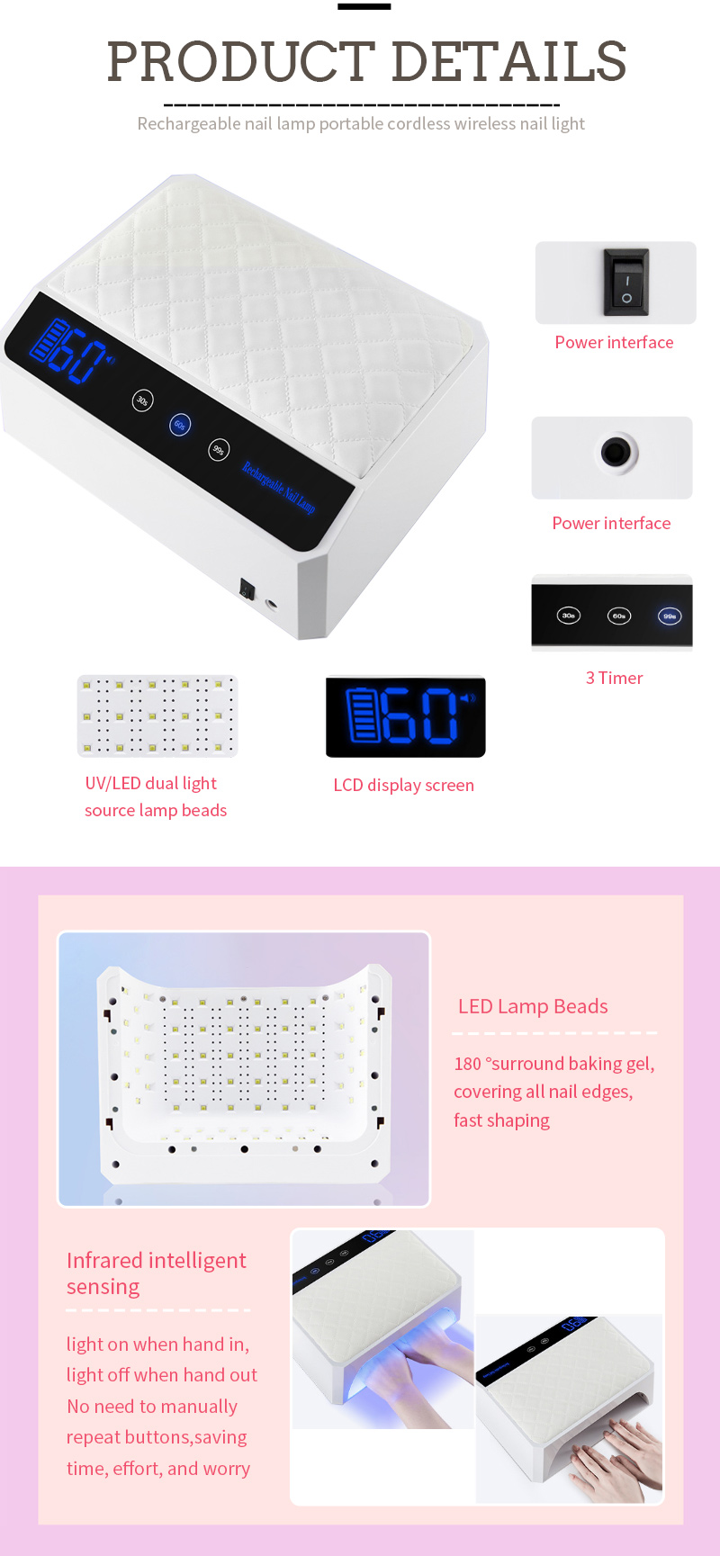 Produkt zajišťuje sušení lepidla bez smršťování. Jeho zdroje dvojího světla poskytují jemné vytápění, aby se zabránilo zabarvení rukou a napětí oka, vhodné pro ruce i nohy, což poskytuje pozoruhodně rychlé výsledky sušení.