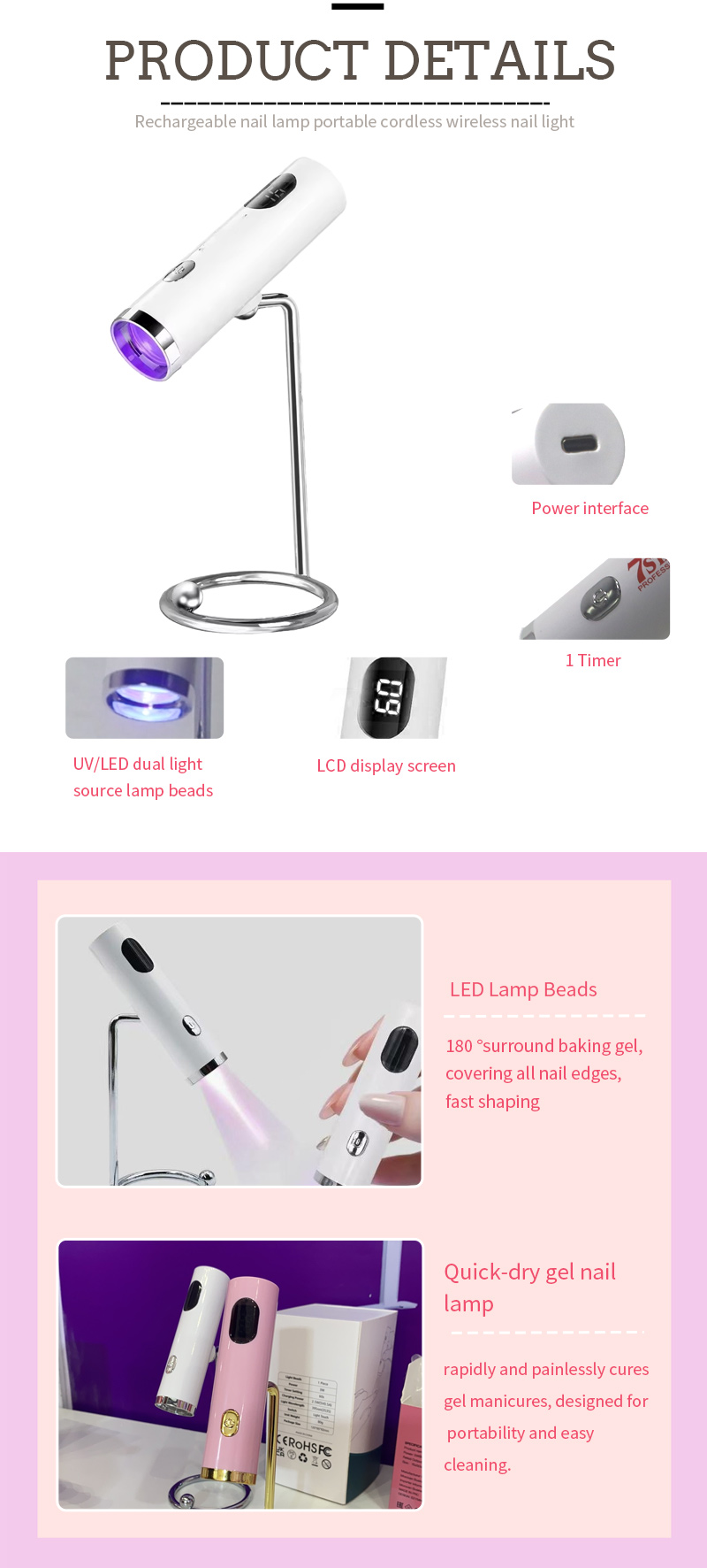 Produkt zajišťuje sušení lepidla bez smršťování. Jeho zdroje dvojího světla poskytují jemné vytápění, aby se zabránilo zabarvení rukou a napětí oka, vhodné pro ruce i nohy, což poskytuje pozoruhodně rychlé výsledky sušení.