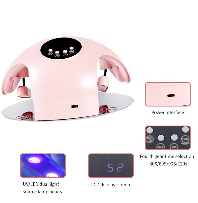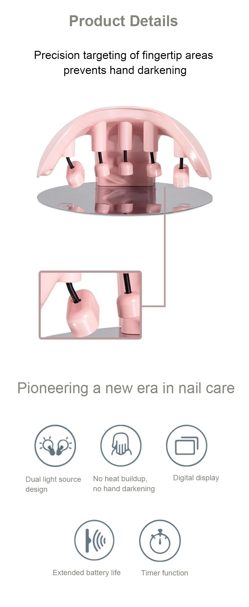 Produkt zajišťuje rovnoměrné zasychání lepidla bez smršťování. Jeho duální světelné zdroje poskytují jemné zahřívání, aby se zabránilo zabarvení rukou a namáhání očí, vhodné pro ruce i nohy a poskytují pozoruhodně rychlé výsledky sušení.