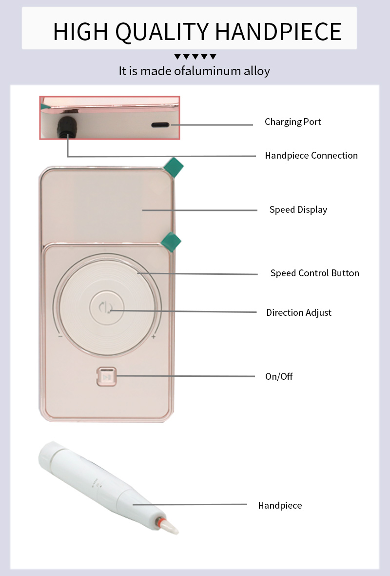 Tento design vysokorychlostního a nízkohlučného brusného pera, se zásuvkou pro brusné pero, LCD displej z tekutých krystalů může zobrazovat počet otáček / výkon / směr, knoflík pro přepínání rychlosti, přepínací tlačítko ve směru hodinových ručiček / proti směru hodinových ručiček, tlačítko pauzy, profesionální motor s 30 000 otáčkami za minutu, šroubovací brusná hlava.