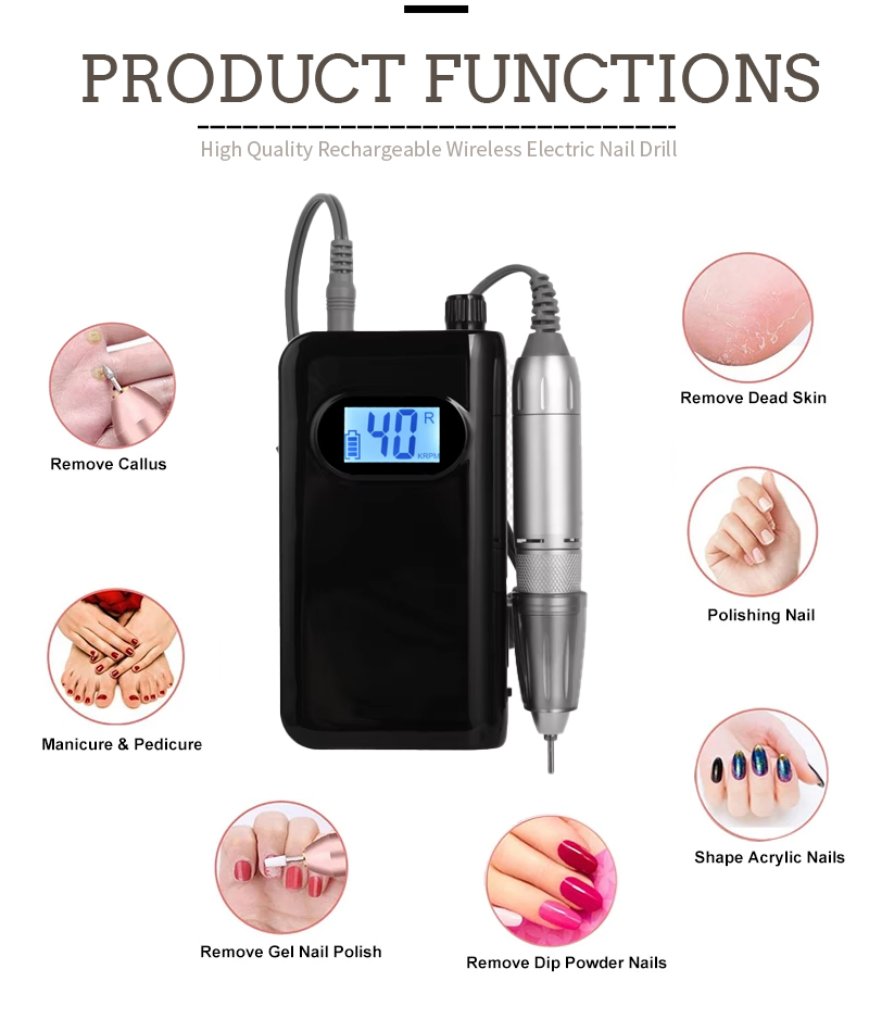 Funkce produktu a aplikace vysokorychlostního souboru elektrického nehtu K91 vysokorychlostních 40 000 ot / min pro odstranění laků na nehty