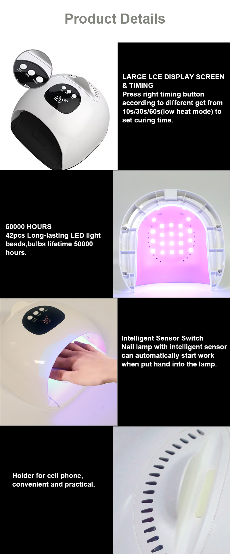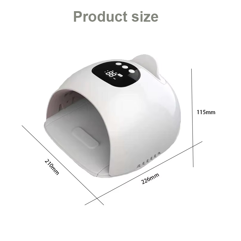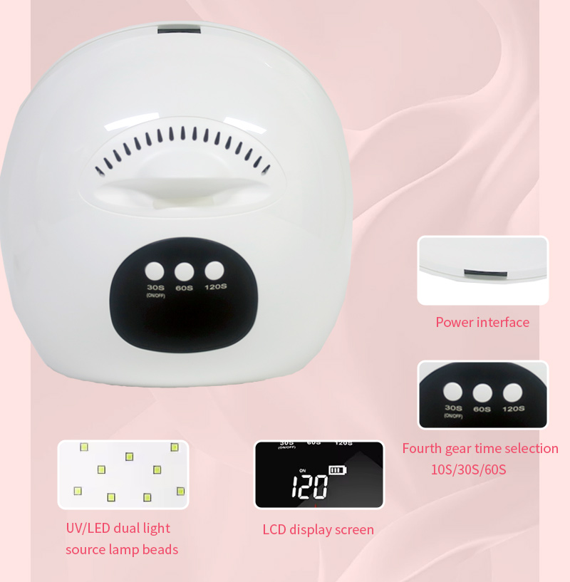 Produkt zajišťuje rovnoměrné zasychání lepidla bez smršťování. Jeho duální světelné zdroje poskytují jemné zahřívání, aby se zabránilo zabarvení rukou a namáhání očí, vhodné pro ruce i nohy a poskytují pozoruhodně rychlé výsledky sušení.