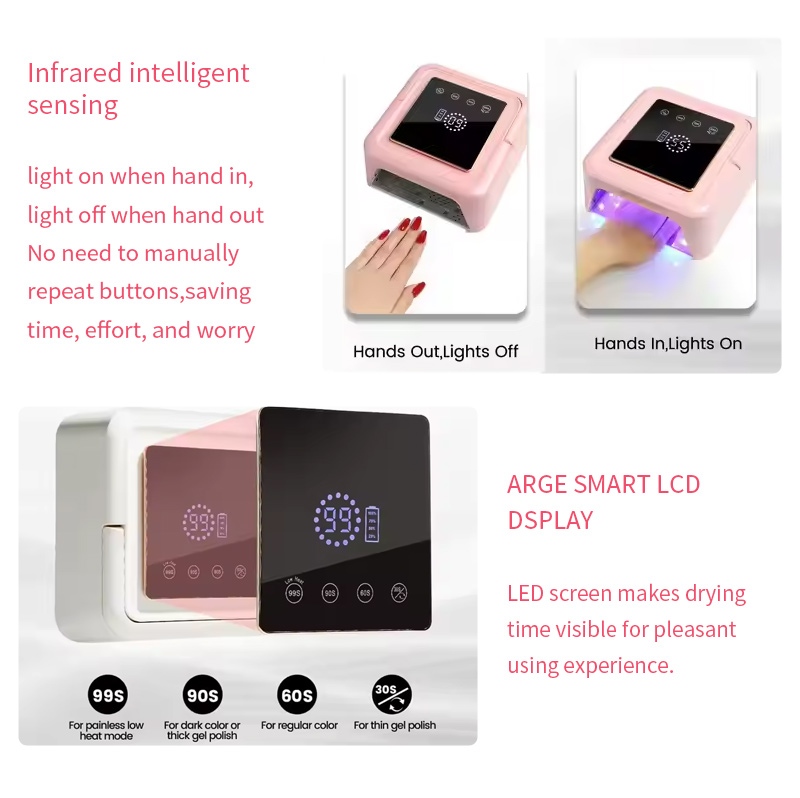 Čtvercová lampa na sušení nehtů je vybavena technologií inteligentního infračerveného snímání, která se automaticky rozsvítí, když se ruce přiblíží, a zhasnou, když se ruce vzdálí, což eliminuje potíže s opakovaným mačkáním tlačítek a šetří čas a námahu. Vysoce výkonné pečicí lepidlo nevyžaduje dlouhé čekání, což šetří čas i námahu.