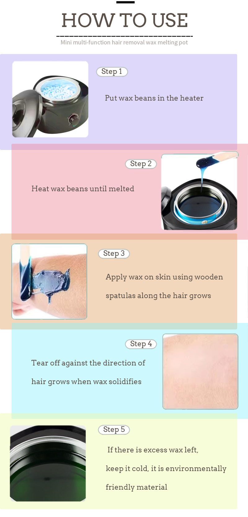 Způsob provozu produktu depilační vosk, čím vyšší teplota, tím rychleji vosk taje, čím nižší teplota, tím pomaleji vosk taje, nejprve nasypte do příslušného množství zrnek depilačního vosku, zahřejte, dokud se zrnka vosku nerozpustí, poté depilační části rovnoměrně potaženého depilačního vosku odtrhnou a nakonec proti směru růstu chloupků odtrhnou.