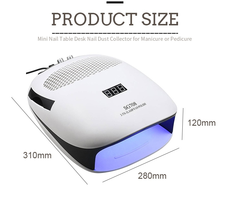 Rozměry trojkombinace ruční lampy na nehty s polštářem jsou 310 mm na délku, 280 mm na šířku a 120 mm na výšku, s velkou kapacitou a možností používat ruce i nohy, což je velmi pohodlné.